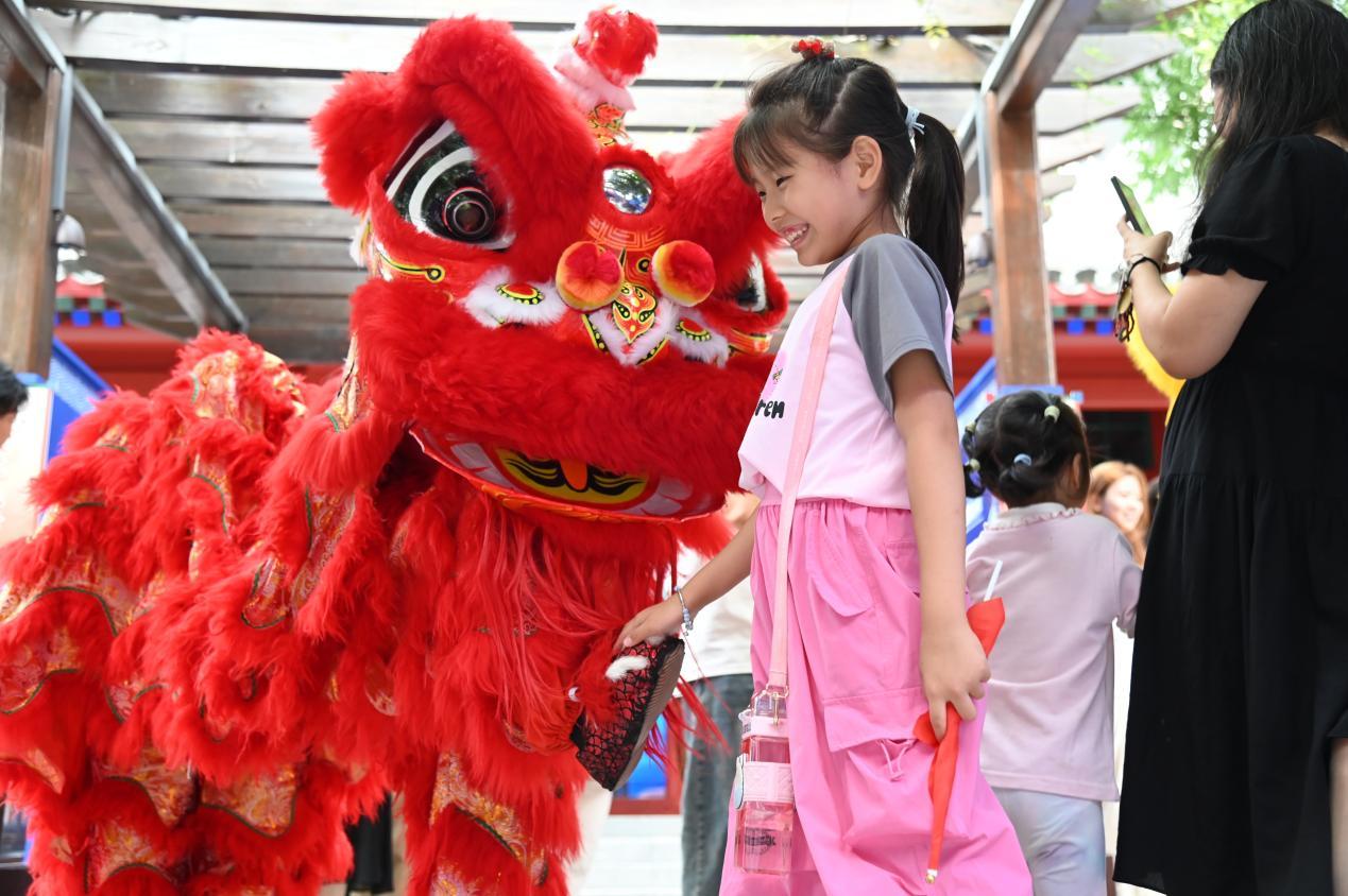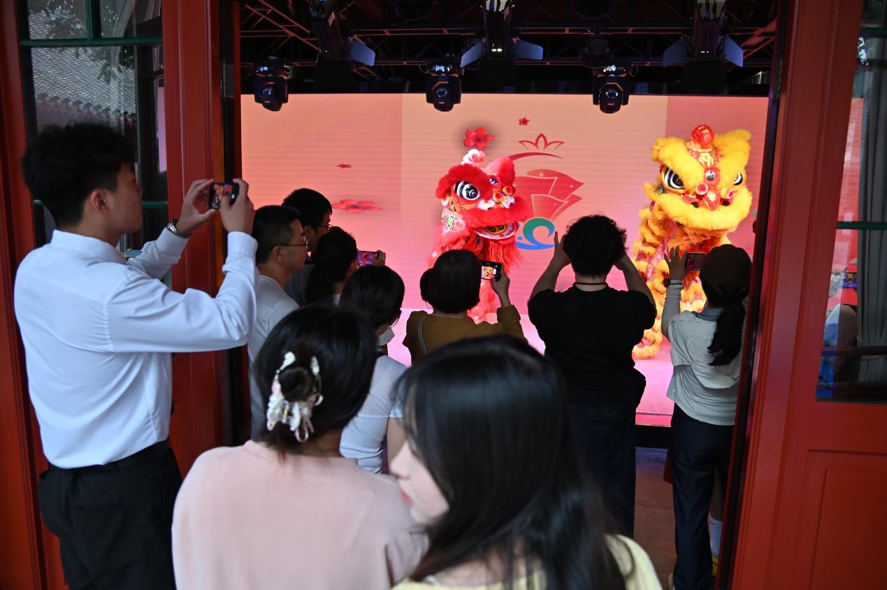 锣鼓声刚起,附近观众便纷纷停下脚步,循着声音向旧址广东体验区聚拢。短短几分钟,表演区域周围就围满了人群。伴随着锣鼓节奏的变化,红狮身披亮片绒毛率先登场,在与小朋友们的互动中舞到院内,黄狮紧随其后,双狮舞动,寓意“送福送吉祥”,现场瞬间爆发出热烈欢呼,不少观众伸手接“福”,笑容满面。